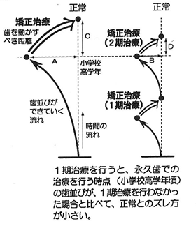 - 実際の治療のすすめ方としては、当面の大きな問題点を解決して、その後生えかわりの期間、様子をみながら、また、悪い方向になるようならそれを解決する装置を入れ、永久歯がはえそろい、さらに歯根も完成して「永久歯列」として落ち着くまで治療が継続します。